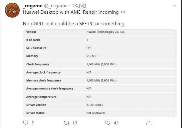 關(guān)于華為電腦的資料目前媒體們所知不多。有一位海外推主曾經(jīng)拿出過一份配置資料:顯示華為臺式機搭載了Ryzen 5 PRO 4400G 處理器,6核12線程,基礎(chǔ)頻率3.7GHz,最高頻4.3GHz。
