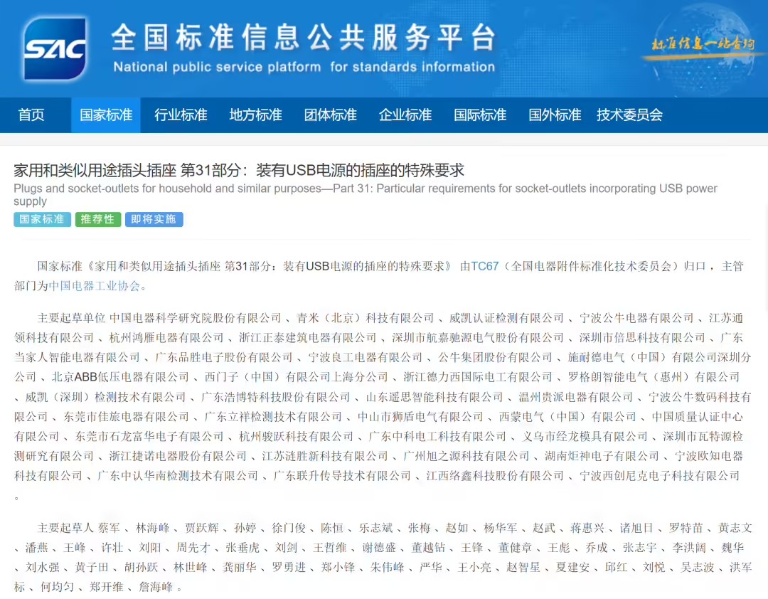 IT之家 5 月 18 日消息,國家市場監(jiān)督管理總局(國家標(biāo)準(zhǔn)化管理委員會(huì))4 月 25 日批準(zhǔn)《家用和類似用途插頭插座 第 31 部分:裝有 USB 電源的插座的特殊要求》等 295 項(xiàng)推薦性國家標(biāo)準(zhǔn)和 2 項(xiàng)推薦性國家標(biāo)準(zhǔn)修改單。其中,USB 電源插座新規(guī)將在 2025 年 11 月 1 日實(shí)施。