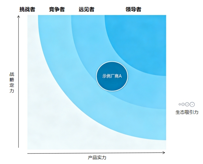 最終,我們不會簡單排出123名,而是繪制出"引力象限圖":X軸代表企業(yè)當(dāng)前的產(chǎn)品實力,而Y軸則代表企業(yè)當(dāng)前產(chǎn)品戰(zhàn)略,圓圈大小則代表生態(tài)吸引力。同時引力象限被劃分為四個區(qū)域——領(lǐng)航者、遠見者、競爭者、挑戰(zhàn)者。這種二維定位比線性排名更能反映企業(yè)的真實處境。